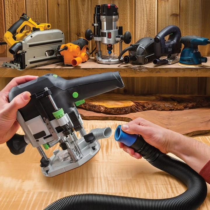 Tuyau extensible et tubulures flexibles permettant de raccorder la plupart des outils électroportatifs à un système de récupération des poussières.