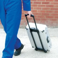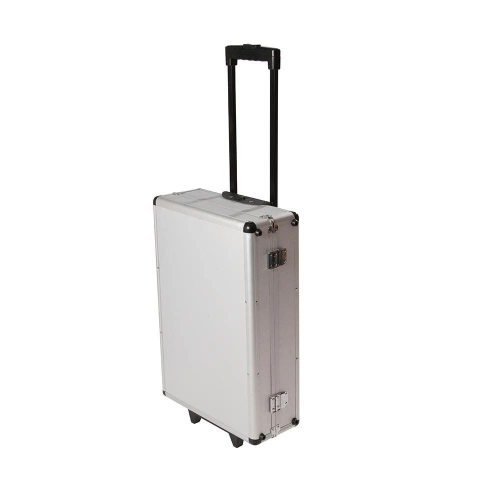 Mallette de transport en aluminium avec roulettes.