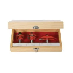 Comprend : fraise à mortaiser Ø 12,7 mm ; fraise à biseau combiné Ø 12,7 mm ; fraise à queue d’aronde Ø 9,5 et 12,7 mm ; fraise à rainure V 90° Ø 12,7 mm ; fraise à gorge rayon 4,76 Ø 9,5 et rayon 6,35 Ø 12,7 mm ; fraise à chanfreiner Ø 22 mm ; fraise à copier oculus Ø 6,35 mm ; fraises droites Ø 6,35, 9,5, 12,7 et 19 mm ; à affleurer Ø 12,7 mm ; à arrondir rayon 3,17 Ø 19,05 mm, rayon 4,76 Ø 22,2 , rayon 6,35 Ø 25,4 et rayon 9,5 Ø 31,7 mm ; fraise à congé rayon 6,35 Ø 22,2 et rayon 9,52 Ø 28,6 mm ; fraise à doucine rayon 3,96 Ø 25,4 mm, fraise à chanfrein Ø 30 mm ; fraise à feuillurer Ø 6,35 mm ; fraise à rainurer Ø 12,7 mm.
