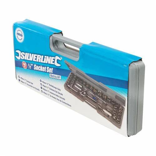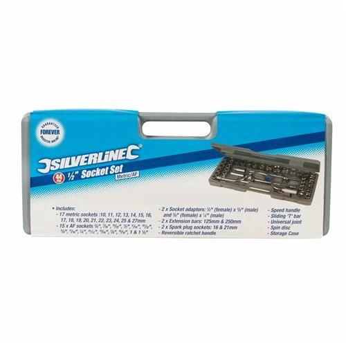 Comprend 2 douilles à bougies, cliquet réversible, vilebrequin, poignée en T coulissante, cardan, 2 rallonges de 125 mm et 250 mm ; 2 adaptateurs 1/2″ (femelle) x 3/8″ (femelle) x 1,4″ (mâle) ; 17 douilles métriques 10-27 mm, 15 douilles AF 3/8″, 7/16″, 15/32″, 1/2″, 9/16″, 19/32″, 5/8″, 11/16″, 3/4″, 25/32″, 13/16″, 7/8″, 15/16″, 1″ et 1 1/8″. Coffret plastique rigide.