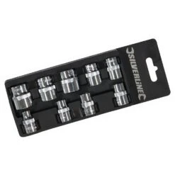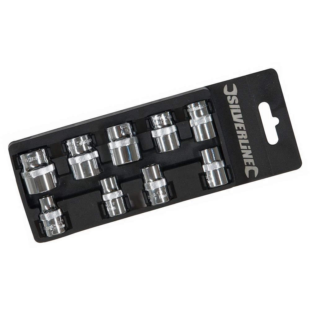 Douilles métriques 6 pans en acier chrome-vanadium, carré conducteur. Contenu : 8, 10, 11, 12, 13, 14, 15, 17 et 19 mm.
