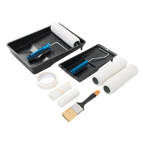 Ensemble complet pour la plupart des tâches de peinture et de décoration. Comprend un ruban de masquage, un pinceau de 50 mm, bacs à peinture, cadres et manchons de rouleaux de 230 mm et de 100 mm.