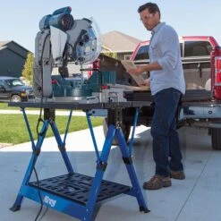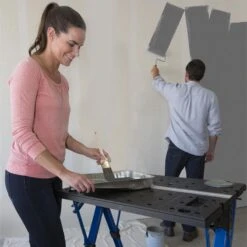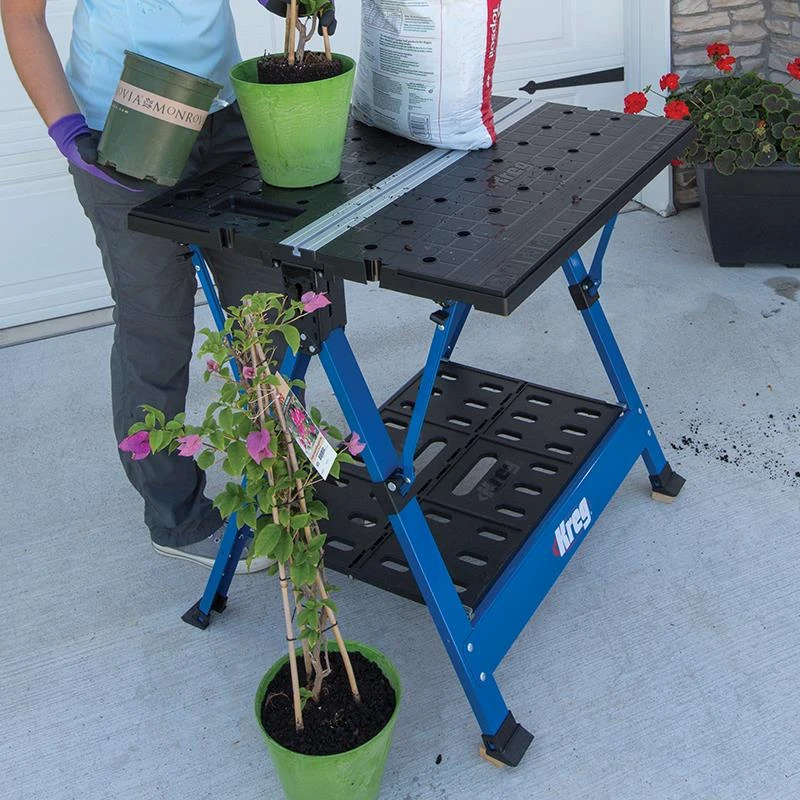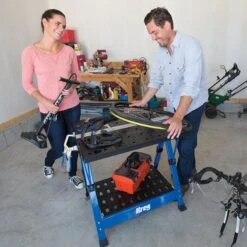 Facile à configurer et à plier pour le rangement. Une fois ouverte, la table supporte jusqu’à 158 Kg et comprends bacs de rangement et étuis pour perceuse et autres poches utiles.